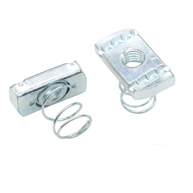 A porca com ranhura em T com mola foi projetada para precisão e facilidade de uso em sistemas de construção modular. O mecanismo de mola garante que a porca permaneça no lugar dentro da ranhura, o que é especialmente benéfico durante a montagem ou quando são necessários ajustes. Isso reduz a necessidade de segurar a porca manualmente, agilizando o processo de montagem.