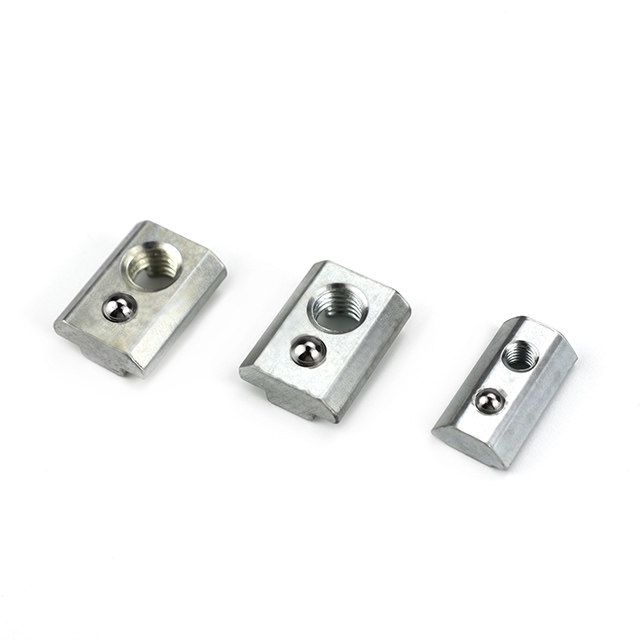 Esta é uma **porca em T com mola esférica**, um componente essencial usado em sistemas de montagem modulares, especialmente com perfis de extrusão de alumínio. A mola esférica permite uma fácil instalação, mantendo a porca firmemente no lugar durante a montagem e evitando que ela caia. O design é ideal para instalação rápida no canal da ranhura em T em qualquer ponto ao longo do perfil.